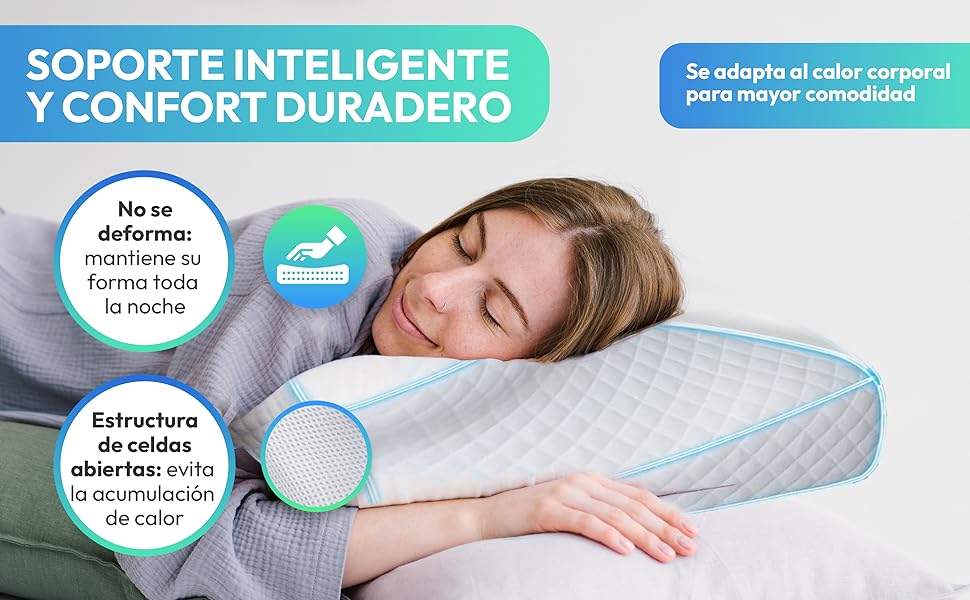Porque combina diseño 2 en 1 curvo/plano + espuma viscoelástica termosensible + funda transpirable hipoalergénica en una almohada reversible y ortopédica, mientras la mayoría son planas, no adaptables o sin ventilación.