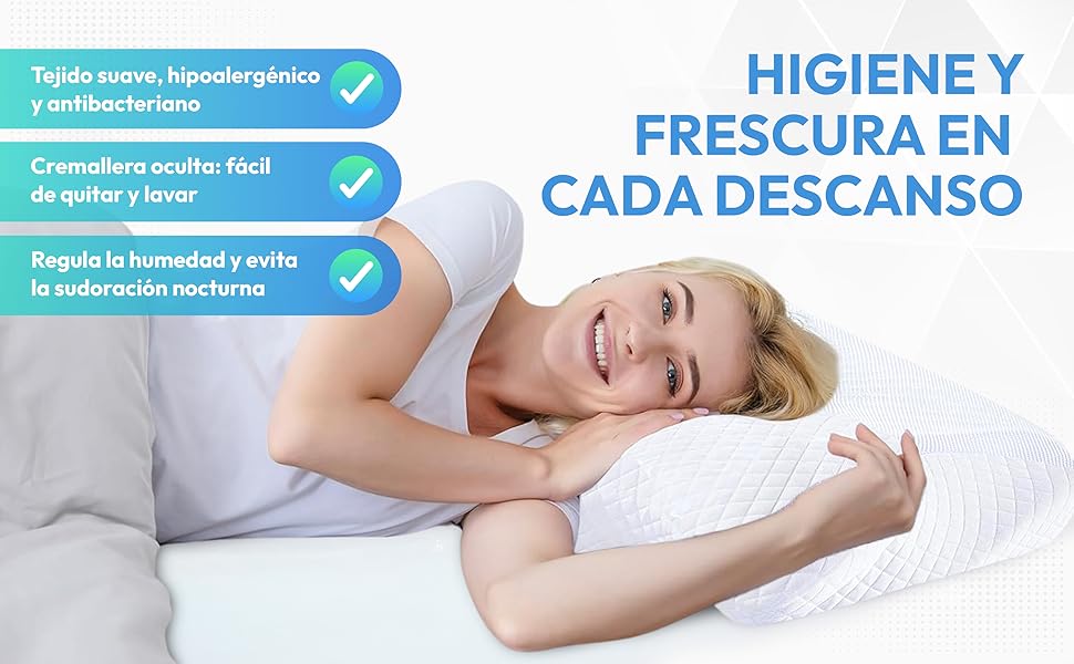 La funda es fresca y respira (no sudas), se quita con cremallera para lavarla en la máquina y evita alergias. Es reversible: elige lado alto o bajo según lo que te guste. Ayuda con dolores cervicales, ronquidos y espalda, para que te levantes fresco y sin molestias. ¡Sencilla y mágica para tus noches!