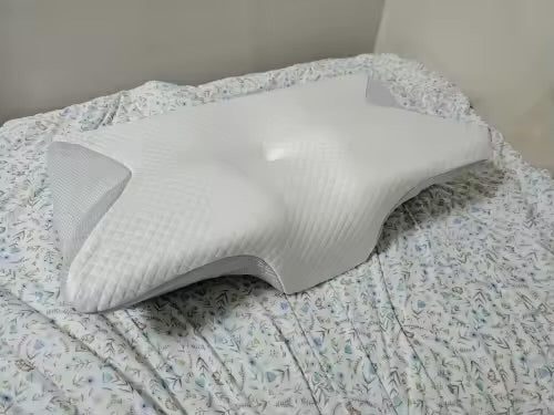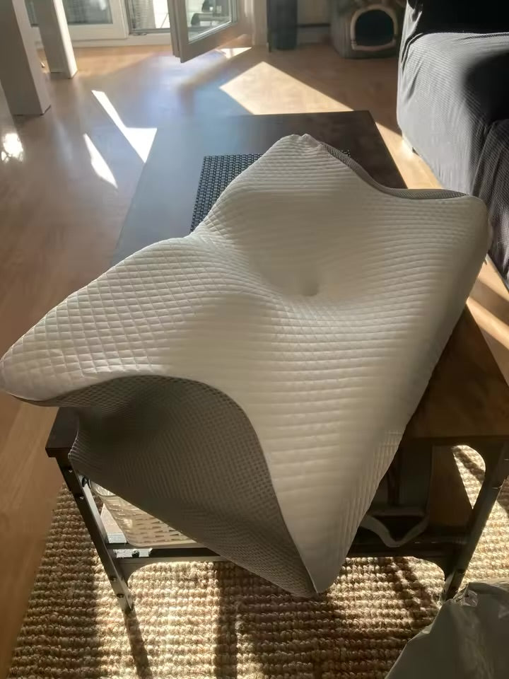 SueñoCervical Pro es una almohada especial para el cuello: tiene un lado curvo que abraza tu cabeza y cuello como un cojín perfecto, y otro lado plano para si duermes boca abajo o cambias de postura. Está hecha de espuma "memoria" que se ablanda con tu calor y se adapta a tu forma, sin hundirse ni dejar tieso.