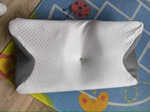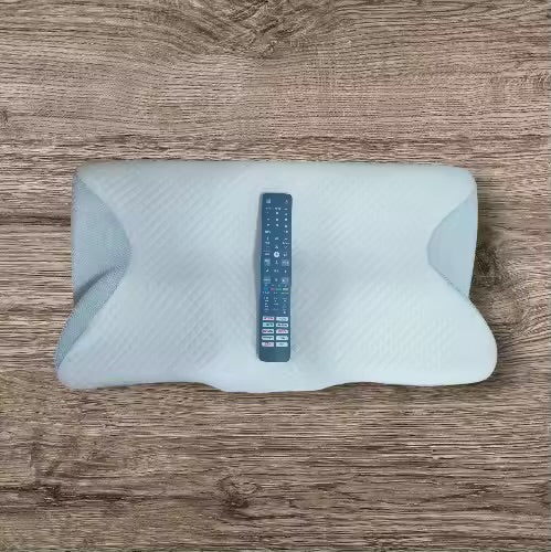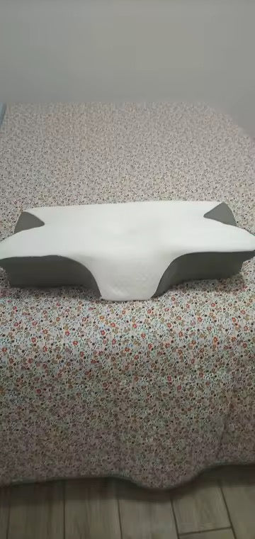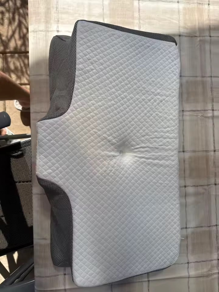 La almohada tiene dos lados: el curvo para apoyar el cuello si duermes boca arriba o de lado (mantiene la columna recta), y el plano para boca abajo o menos soporte. La espuma memoria se ablanda con tu calor corporal, moldeándose a tu cabeza y cuello para distribuir el peso y quitar presión.